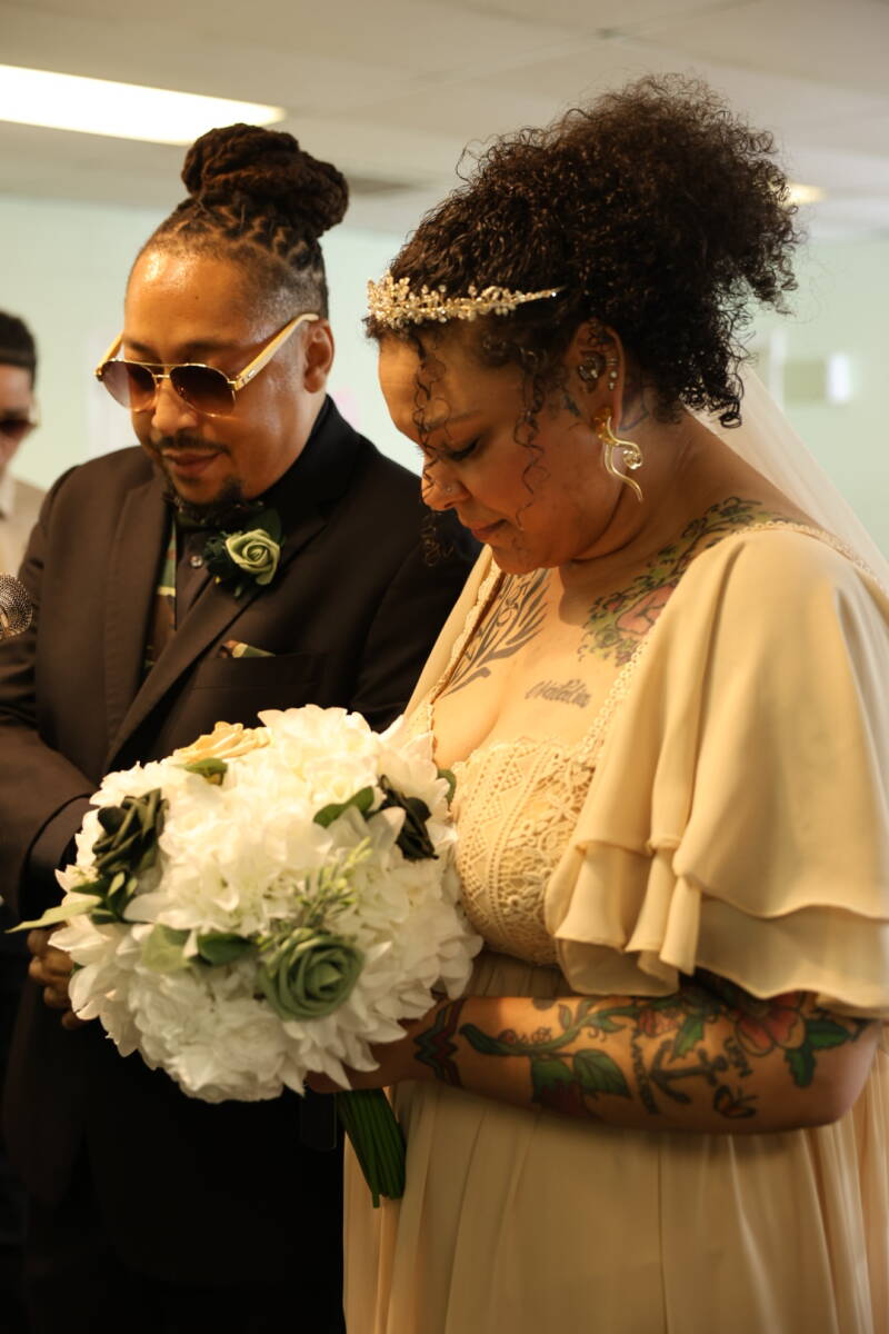 A joyful covenant moment at the altar as Apostle Coffield officiated Deacon-Elect Carson’s wedding, covered in prayer.